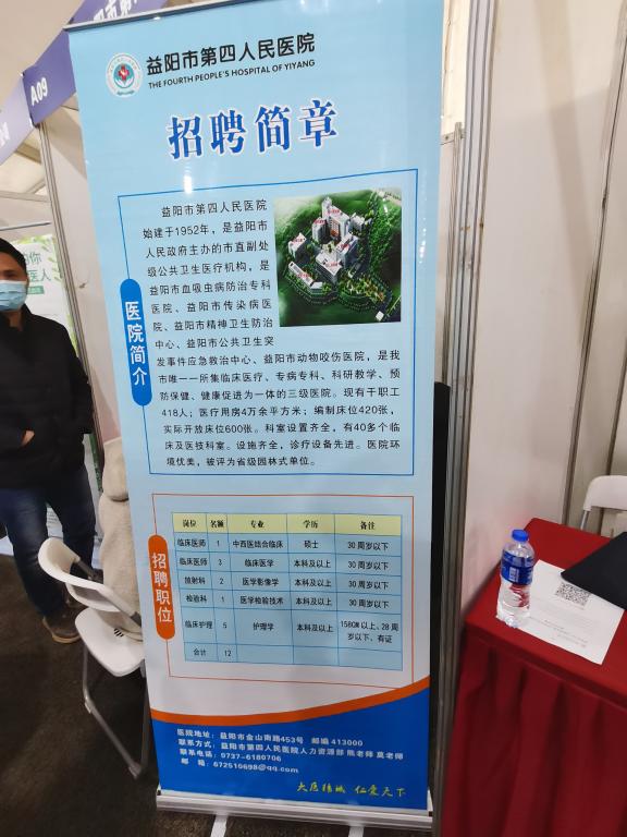 11月28日上午,益阳市第四人民医院在含浦足球场进行了线下招聘活动。益阳市第四人民医院始建于1952年,是益阳市人民政府主办的市值副处级公共卫生医疗机构,是益阳市血吸虫病防治专科医院、益阳市传染病医院、益阳市精神卫生防治中心、益阳市公共卫生突发事件应急救治中心、益阳市动物咬伤医院,是益阳市唯一一所集临床医疗、专病专科、科研教学、预防保健、健康促进为一体的三级医院。现有干职工418人;医疗用房4万余平方米;编制床位420张,实际开放床位600张。科室设置齐全,有40多个临床及医技科室。