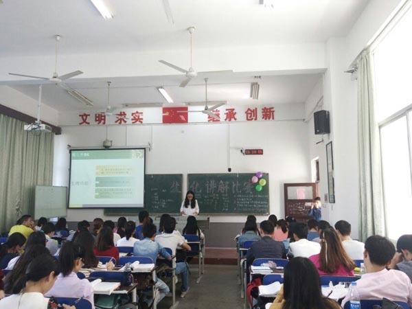 老师简单阐述比赛内容后,比赛正式开始。首先,两班共80人按照维生素的种类分成15个小组。随后,各小组按抽签的顺序依次上台进行课堂讲解,搭配着精美的PPT,把知识要求形象的展示在大家眼前。紧接着的老师提问,小组成员也给出了精彩的答案。课堂气氛十分融洽。最后,任课老师做总结性发言,对同学们的表现一一点评,并宣布本次比赛的获奖名单。至此,此次生物化学讲解比赛圆满结束。
