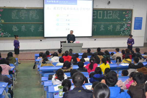 11月19日晚,我校副校长、博士生导师周小青教授应邀为医学院2012级新生作专业教育讲座。医学院党总支书记肖子曾教授、党总支王健副书记、学生管理科老师和320多名2012级新生一起听取了讲座。