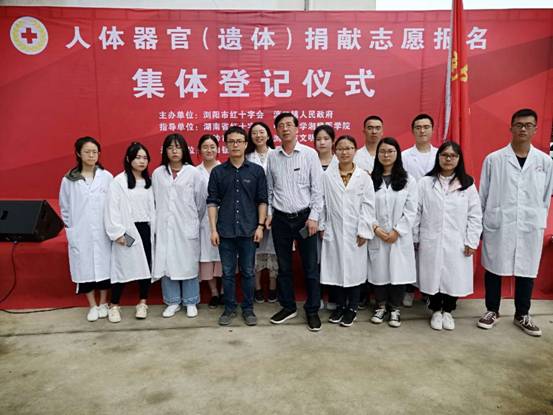由湖南中医药大学医学院解剖教研室主任李新华教授、杨奔老师带领12名医学院学生参加了湖南省红十字会人体器官捐献管理中心、长沙市红十字会、浏阳市红十字会等共同筹办的“人体器官(遗体)捐献志愿报名集体登记仪式”。