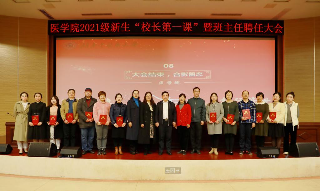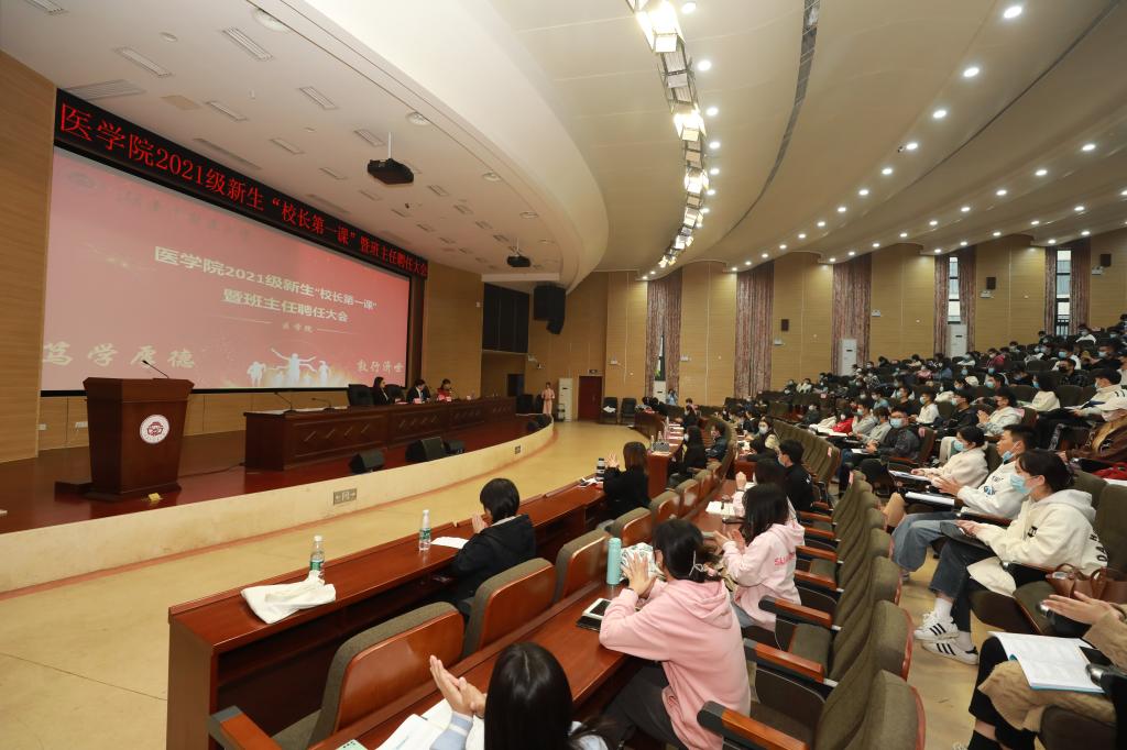 11月16日下午,校(院)长戴爱国在第三教学楼学术报告厅为医学院2021级新生开讲“校长第一课”并参加班主任聘任大会。医学院相关负责人、全体辅导员、2021级班主任及240余名新生和党员代表参加大会。会议由医学院党委书记文红艳主持。