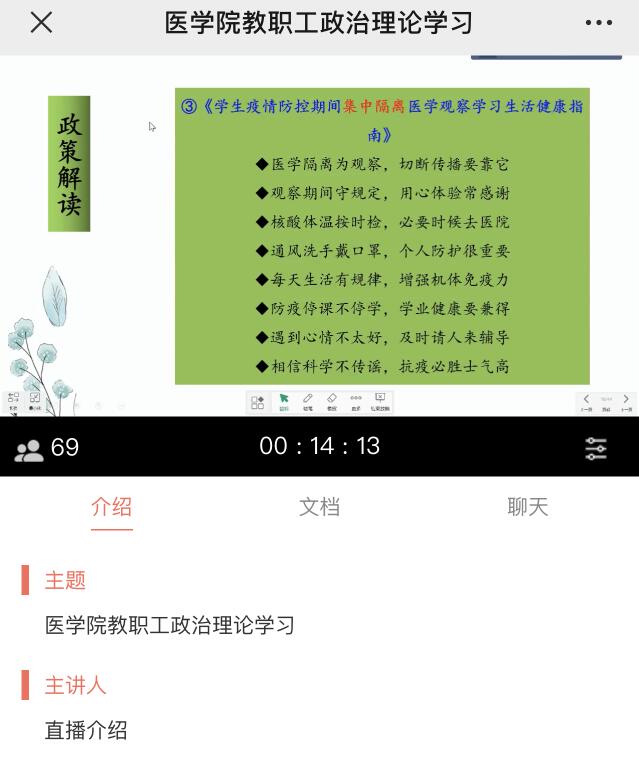 为贯彻落实习近平总书记重要讲话精神和中央政治局常委会会议精神,根据省教育厅新冠肺炎疫情防控指挥部及湖南中医药大学疫情防控领导小组部署,医学院于4月21日召开新冠肺炎疫情防控专题培训,旨在切实提高师生常态化防控和应急处置能力、织牢疫情防护网。本次培训采取线上与线下相结合的形式,学院全体领导、各教研主任在学院会议室参加线下学习、其余教职工通过学习通APP参加线上学习。