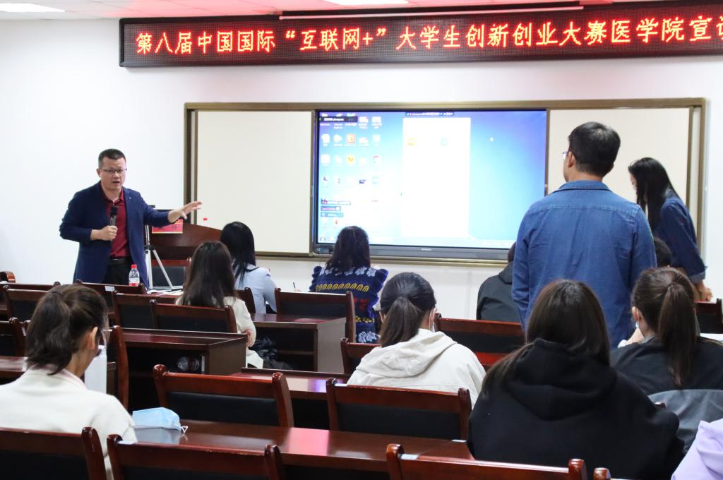 5月11日下午3点,第八届中国“互联网+”大学生创新创业大赛医学院宣讲会在含浦校区第三教学楼13楼医学院会议室举行,会议由腾讯课堂在线同步进行。主讲嘉宾为教务处质量工程建设办公室副主任何运生和第七届“互联网+”国赛评委魏科老师。会议由医学院党委副书记任婷主持。我院部分项目指导老师,科教科和学生科部分老师积极参加了会议。
