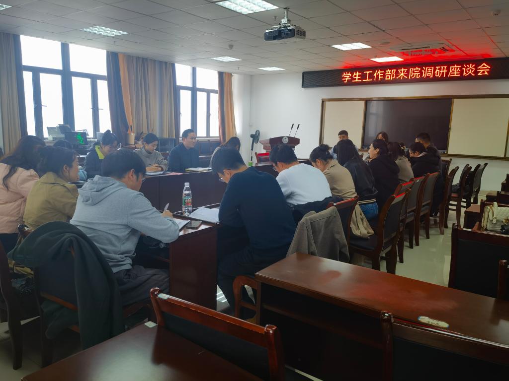 2月28日中午12时30分,我校学生工作部部长朱久宜带队来院调研座谈,学院党委副书记任婷及全体辅导员参加座谈会。