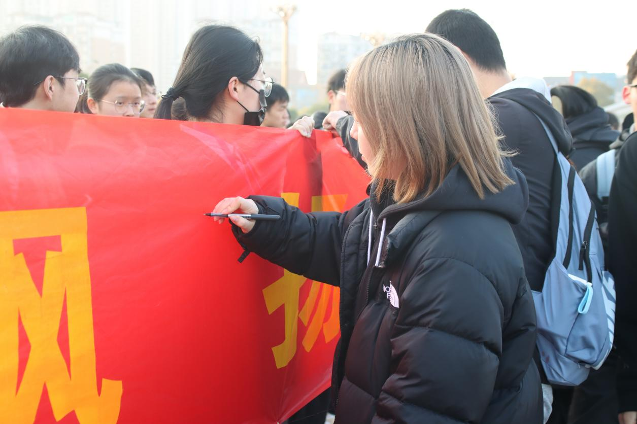 仪式最后,学生代表在横幅上签名,表达对初心使命的坚守和对未来的担当。