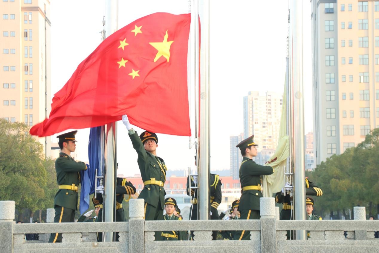 7时整,国歌奏响,全体师生整齐肃立,向国旗行注目礼,对伟大祖国致以最崇高的敬意。随后,校旗伴随着校歌缓缓上升,与国旗一同迎风飘扬。