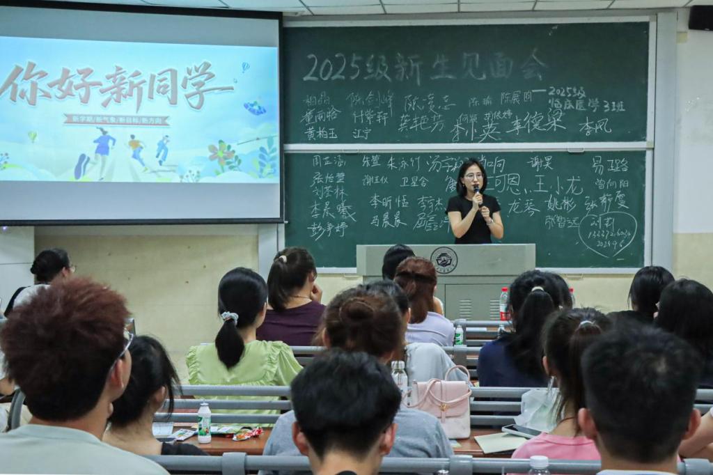 当晚,各班级开展2025级“新生见面会”活动,新生与班主任、辅导员及同伴学长齐聚一堂进行首次集体交流。见面会围绕高中到大学的过渡适应、医学专业认知及学业规划等实际问题展开。新生们依次进行自我介绍,展示不同的成长背景与艺术特长;班主任细致讲解专业培养目标与课程体系,帮助学生树立学习方向;辅导员深入介绍校纪校规、校园资源与支持政策,强化新生的归属感和纪律意识;同伴学长则结合自身经历,分享实用学习经验和生活建议,为新同学提供切实可行的入学指引。