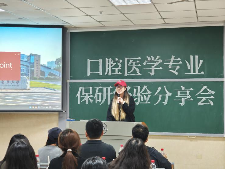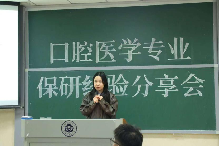 为精准助力口腔医学专业学子明晰深造路径、汲取宝贵经验,2025年10月30日晚七点,21级口腔医学专业保研经验分享会于济世楼209教室顺利举行。本次分享会由2024级口腔医学4班黄熙然同学主持。活动特邀21级已成功保研的彭瑞璇、杨盼、邓芳萍、周念念四位优秀学子担任主讲。他们结合自身经历,分别从目标定位、院校选择、材料准备、面试技巧及心路历程等不同维度,倾情分享了各自的成功经验与独到见解,为在场同学带来了一场内容翔实、干货满满的经验盛宴。医学院学生科副科长李轶哲老师、21级口腔医学专业辅导员赵宇玺老师、22级与24级口腔医学专业辅导员邹翔老师亦莅临现场,密切关注同学们的学业发展,并就保研规划与策略提供了宝贵的专业指导。