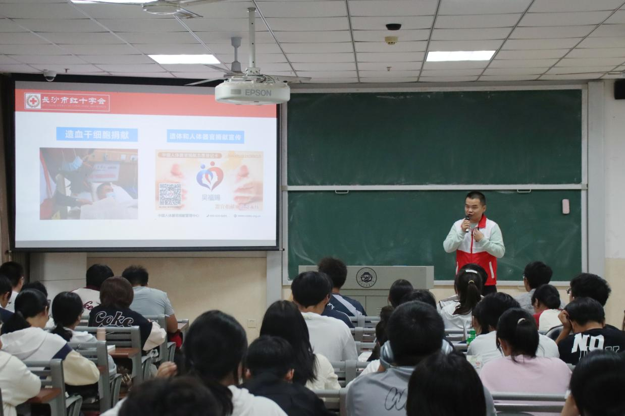 长沙市红十字会宣讲团老师为同学们系统讲解了红十字运动的基本知识,并重点围绕“三献”——无偿献血、造血干细胞捐献、遗体和人体器官捐献的科学原理、社会意义、捐献流程及政策法规进行了深入浅出的介绍,并通过真实的案例,让同学们深刻理解了“三献”在延续生命、推动医学进步中的不可替代作用。